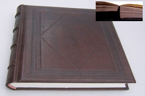 ![]() Oprawa skórzana albumowa, ręczne szycie z przekładkami - ruchomy grzbiet pozwala na szerokie otwarcie, bez fałd, kart albumu, zwięzy na grzbiecie, kapitałki szyte ręcznie, tłoczenie ornamentów suche na grzbiecie i okładkach Format 28 x 38 cm, 150 kart. papier ozdobny albumowy 180 g/m2 - skóra licowa - wyklejka z papieru ozdobnego |