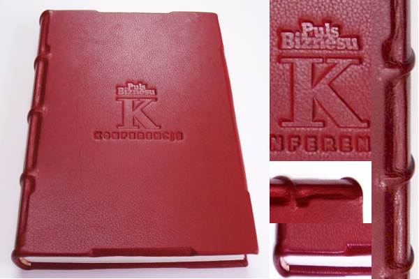 ![]() Oprawa skórzana, szycie na sznury, prawdziwe wysokie zwięzy na grzbiecie, kapitałki szyte ręcznie, krawędzi okładek przycięte na skos, tłoczenia suche logotypu i tytulatura na okładce przedniej Format A4+, 30 ark. papier ozdobny 150 g/m2 - skóra licowa - wyklejka z papieru ozdobnego |