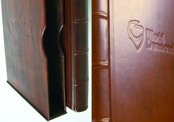 ![]() Oprawa skórzana, szycie ręczne kart, wysokie zwięzy na grzbiecie, kapitałki szyte ręcznie, tłoczenia ślepe, futerał skórzany Format 28 x 38 cm, 200 kart, papier ozdobny 140 g/m2 - skóra naturalna - wyklejka z papieru ozdobnego |