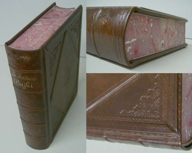 ![]() Oprawa skórzana z wolnym grzbietem, prawdziwe zwięzy, wyklejka przeszywana z papieru ręcznie marmoryzowanego, kapitałka płaska szyta ręcznie, tłoczenia ślepe, krawędzi kart marmoryzowane ręcznie, okładki reliefowane. - Format B4, ca 250 kart, papier 100 g. - skóra koźla - wyklejka z papieru marmor. 120 g. |