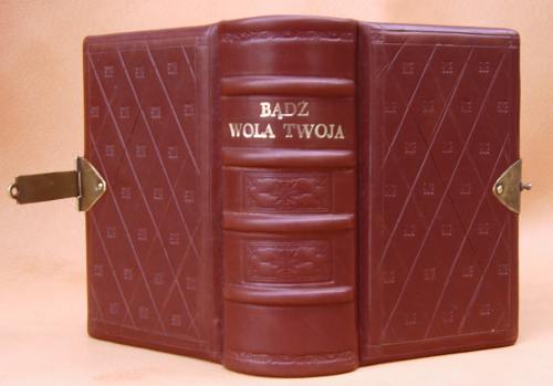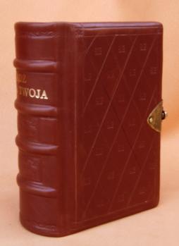 ![]() ![]() Oprawa skórzana, wyklejka z papieru czerpanego, ręczne szycie na 3 taśmy, kapitałka płaska szyta ręcznie, sztuczne zwięzy, złocona tutulatura, tłoczenia ślepe grzbietu i okładek, zapinka mosiężna - Format: 16 x 11 cm, papier 100 gr. - skóra cielęca nr 2: K 23 - wyklejka z czerpanego papieru 120 gr. |