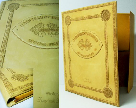 ![]() Oprawa skórzana stylizowana, teka na stare grafiki, wyklejka skórzana i z papieru ręcznie antykowanego, skórzane skrzydełka, tłoczenie suche tytulatury na okładce przedniej, zdobienia reliefowe na okładkach, tłoczenia suche. - Format ca B2 - skóra cielęca antykowana |