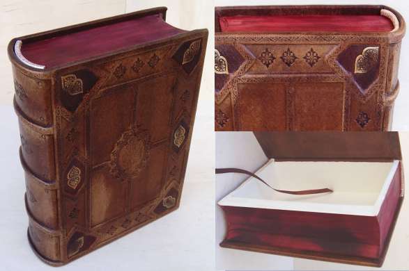 Pudełkowa atrapa książki, replika starodruku oprawiona w skórę, ukształtowanie zwięzów, reliefowanie okładek-wieczka, tłoczenia ślepe i złotem, kapitałki szyte ręcznie, prawdziwe krawędzi kart, barwione, wnętrze pokryte antykowanym papierem ręcznie czerpanym Rozmiar: 24 x 18 x 8 cm - skóra licowa szlachetna antykowana - wyklejka - papier ręcznie czerpany antykowany |