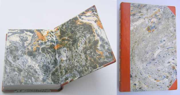 ![]() Oprawa skórzana uproszczona, wyklejona papierem marmoryzowanym ręcznie, szycie maszynowe, wyklejka z papieru ozdobnego, zwięzy na grzbiecie, kapitałka szyta ręcznie, złocenia tytulatury na grzbiecie, tłoczenia złotem. - Format B5, ok. 11 ark. - skóra cielęca antykowana - papier wyklejkowy marmoryzowany ręcznie - marmurkowy |