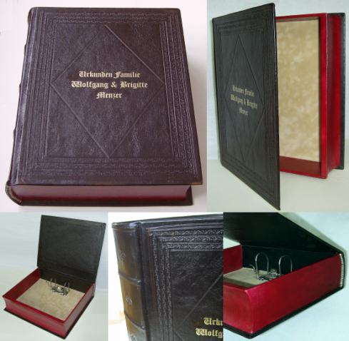 Segregator rodzinny skórzany pudełkowy - imitacja starej księgi, bindy (zgrubienia na grzbiecie), ozdobne tłoczenie na wyokrąglonym grzbiecie, tłoczona sygnacja złotem na zdobionej okładce - wieczku, wyokrąglone ręcznie malowane na skórze "krawędzi kart", trwale montowany mechanizm segregatora, otwierane wieko, wyklejony wewnątrz flokiem (imitacją zamszu), ręcznie szyte kapitałki.
